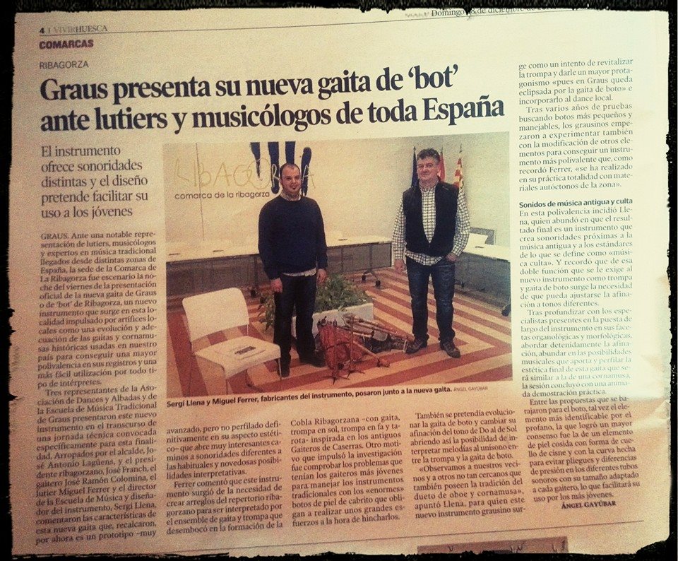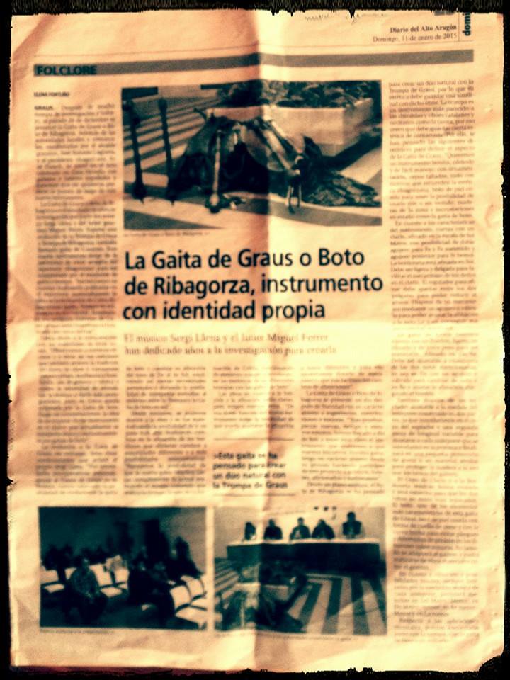 Observamos a nuestros vecinos y a otros no tan cercanos que también poseen la tradición del dueto de oboe y cornamusa (musa y pifaro, koz binoui y bombarda, sac de gemecs y tarota...). Vemos la necesidad de revitalizar la Trompa y darle más protagonismo, pues en Graus queda eclipsada por la gaita de boto. Surge en conversaciones la idea de incorporar dicho instrumento en el Dance que actualmente se interpreta única y exclusivamente por gaitas de boto. Por necesidades interpretativas personales, ajenas al Dance de Graus y a la Trompa, vamos valorando la posibilidad de evolucionar la gaita de boto y cambiar su afinación del tono de Do al de Sol, resolviendo así ciertas necesidades personales y abriendo la posibilidad de interpretar melodías al unísono entre la Trompa y la Gaita de Boto en Sol. Desde ese momento, empezamos a trabajar, vamos pensando en ir un paso más allá realizando más cambios en la afinación de los bordones que nos abren caminos a sonoridades diferentes y a más posibilidades interpretativas. Barajamos la posibilidad que la nueva gaita, complemente la actual realizando el mismo cometido que realiza la Trompa dentro de la formación de Cobla funcionando de elemento sonoro que cohesione las tímbricas de las diferentes Trompas con las Gaitas de Boto.Tenemos ideas claras de la función y de la afinación, pero de esa doble función del nuevo instrumento surge la necesidad de que pueda ajustarse la afinación a tonos diferentes y para ello necesitamos dotarlo de mecanismos que nos faciliten los cambios de afinaciones.Tras pruebas, piezas nuevas, tiempo y ensayos sonoros, hemos llegado a día de hoy, a tener muy claro el instrumento que queremos y que nuestra iniciativa, nuestra gaita, tenga un carácter abierto desde su génesis haciendo partícipes de este proyecto a músicos, luthiers, aficionados, melómanos...